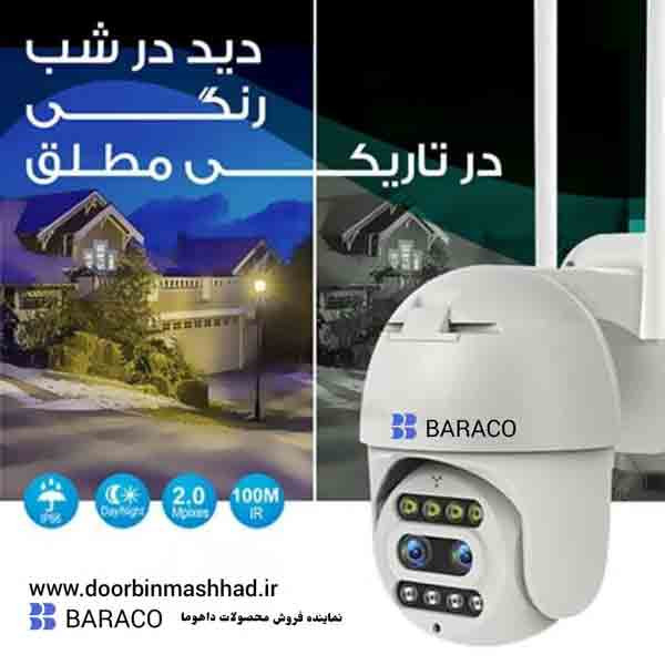 دوربین مداربسته بیسیم - تحت شبکه و سیمکارتی BARACOاز پرکاربردترین ها هستند که با نصب آسان بدلیل قابلیت بیسیم و اتصال به شبکه بسیار مورد توجه قرار گرفته اند. دوربین مداربسته BARACOبا قابلیت ضد آب قابل نصب در مکان های خارجی است که تصاویر و صدا را با کیفیت 2 مگاپیکسل نمایش می دهد. دارای زوم تا 10 برابر در فاصله 70 متری است و با قابلیت چرخش به 4 جهت (افقی و عمودی) کل ناحیه مورد نظر را پوشش می دهد؛ با مجهز بودن به سیستم دزدگیر هوشمند، با تشخیص سوژه و احساس خطر با صدای آژیر هشدار می دهد. دوربین مداربسته BARACO قابلیت دید در شب در دوحالت قابل تنظیم سیاه و سفید، رنگی وجود دارد که تصاویر و صدا با کیفیت و وضوح از طریق نرم افزار موبایل به صورت زنده نمایش داده می شود. دوربین مداربسته s44 با دسترسی به wifi یا سیمکارت اینترنت مورد نیاز سیستم را فراهم می کند. هم چنین توسط یک کارت حافظه Micro SD از 8 تا 128 گیگابایت جهت ذخیره تصاویر دوربین مداربسته می توان استفاده کرد. در ضمن جهت تامین برق دوربین مداربسته بدون قطعی نیاز به UPS های 12 ولتی است که تامین برق اضطراری این دوربین را تا 2 ساعت فراهم می کند